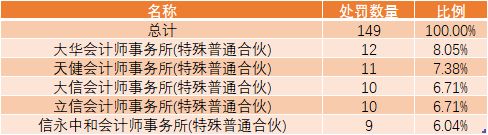 今年以来处罚数量排名前五的会计师事务所情况。数据来源:同花顺