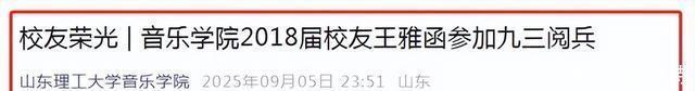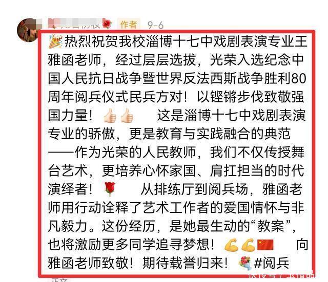 早在9月5日,山东理工大学音乐学院就发布了祝贺文章,庆祝2018届校友王雅函参与阅兵凯旋,并分享了很多采访内容。