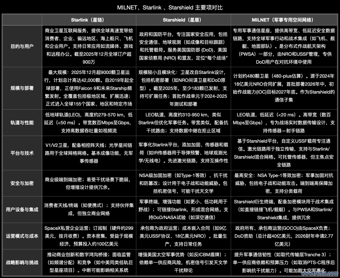 这不是一套给战场加带宽的低轨卫星,而是一张专为高强度对抗环境设计的军事专用空间网络:它不对公众开放,不追求规模扩张,不服务商业市场,却被直接嵌入美国太空军的作战体系,成为继Starlink之后、独立存在、可在战时脱离商业网络运行的第二层通信骨干。MILNET的真正价值,并不在于使用SpaceX卫星,而在于它标志着美国军事太空通信,从借用商业网络走向专属网络成型的关键拐点。