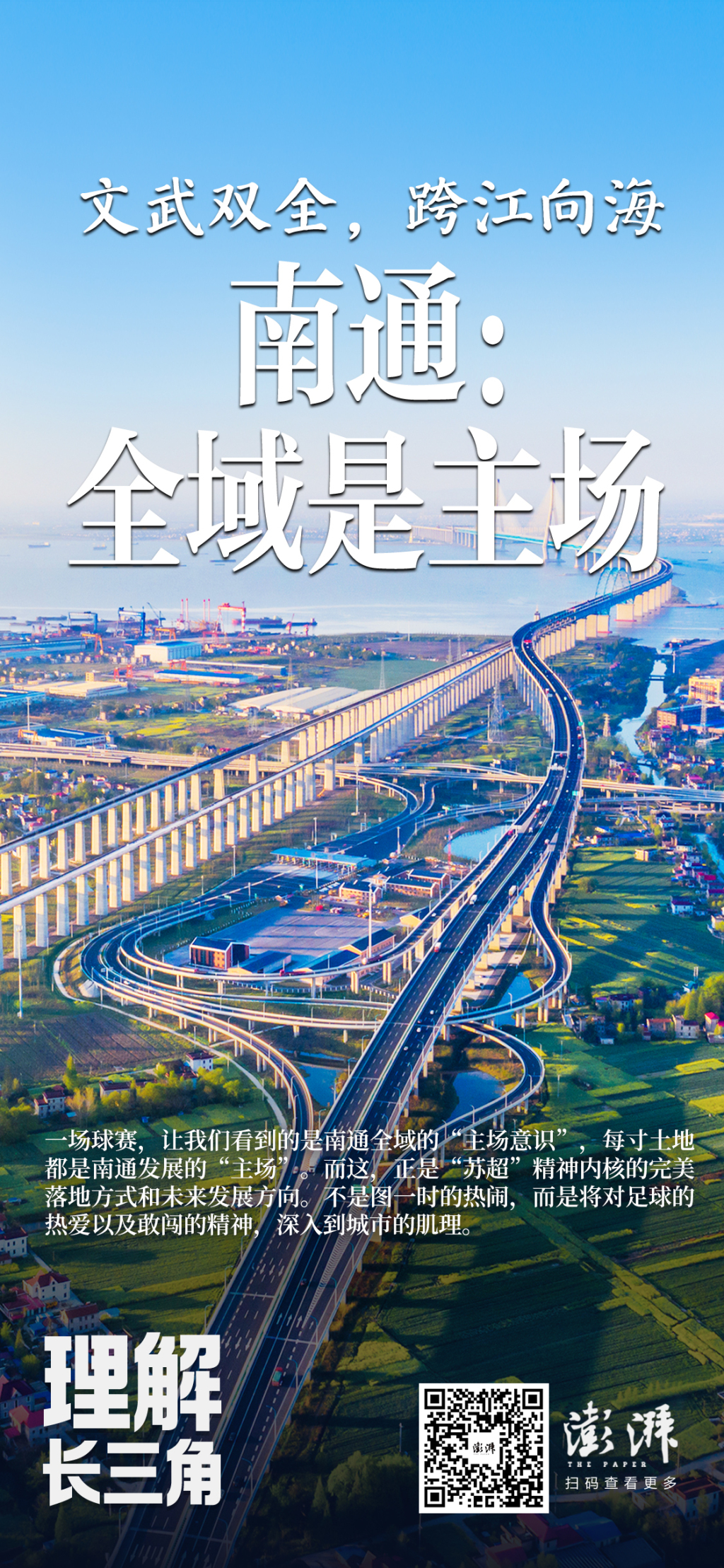 就城市来说,“全域是主场”拥有超越足球之上的深刻内涵。全域是物理层面的,也是精神层面的、人文层面的,更大一点说,打造全省高质量发展重要增长极,更好地融入长三角一体化发展,南通全域都在树立“主场意识”,每寸土地都是南通发展的“热血主场”。