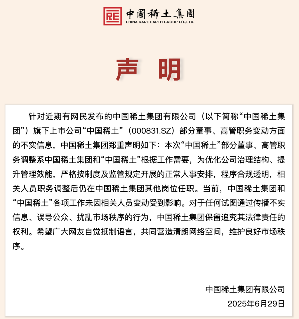 6月29日午间,央企中国稀土集团发布声明。中国稀土集团表示,针对近期有网民发布的中国稀土集团有限公司(以下简称“中国稀土集团”)旗下上市公司“中国稀土”(000831.SZ)部分董事、高管职务变动方面的不实信息,中国稀土集团郑重声明如下:本次“中国稀土”部分董事、高管职务调整系中国稀土集团和“中国稀土”根据工作需要,为优化公司治理结构、提升管理效能,严格按制度及监管规定开展的正常人事安排,程序合规透明,相关人员职务调整后仍在中国稀土集团其他岗位任职。当前,中国稀土集团和“中国稀土”各项工作未因相关人员变动受到影响。