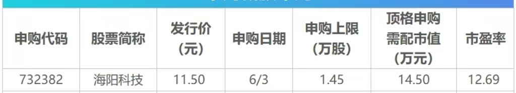 Wind数据显示,本周将有1只新股发行。6月3日,海阳科技进行网上申购,申购代码为732382。公司本次公开发行股票数量为4531.29万股,发行后公司总股本约为1.81亿股,发行价格为11.5元/股。