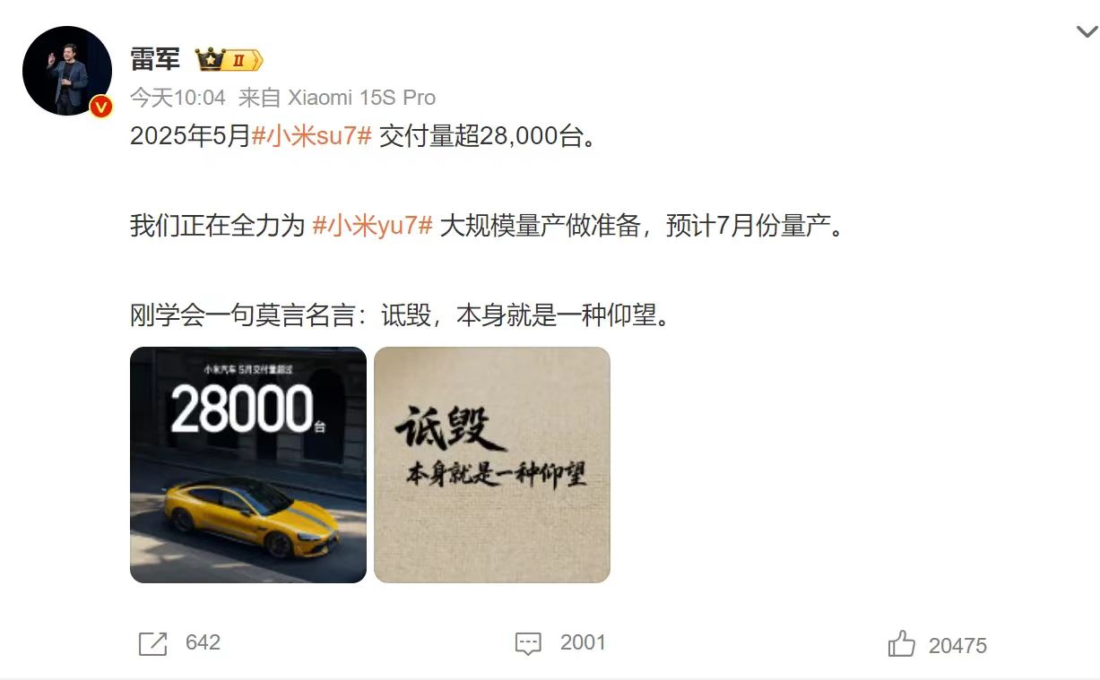 6月1日,雷军发布微博称,2025年5月小米SU7交付量超28000台。我们正在全力为小米YU7大规模量产做准备,预计7月份量产。