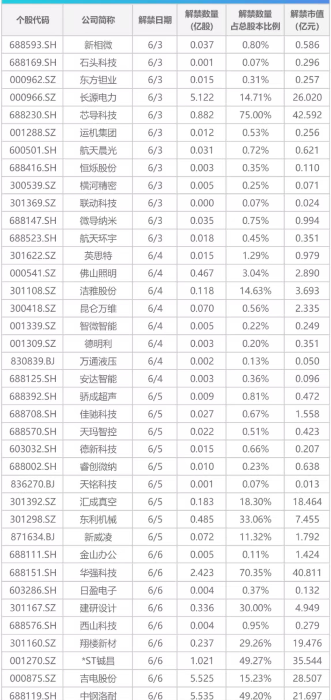 本周(6月3日-6月6日)共有38家公司限售股陆续解禁,合计解禁22.76亿股,按5月30日收盘价计算,解禁总市值为266.66亿元。